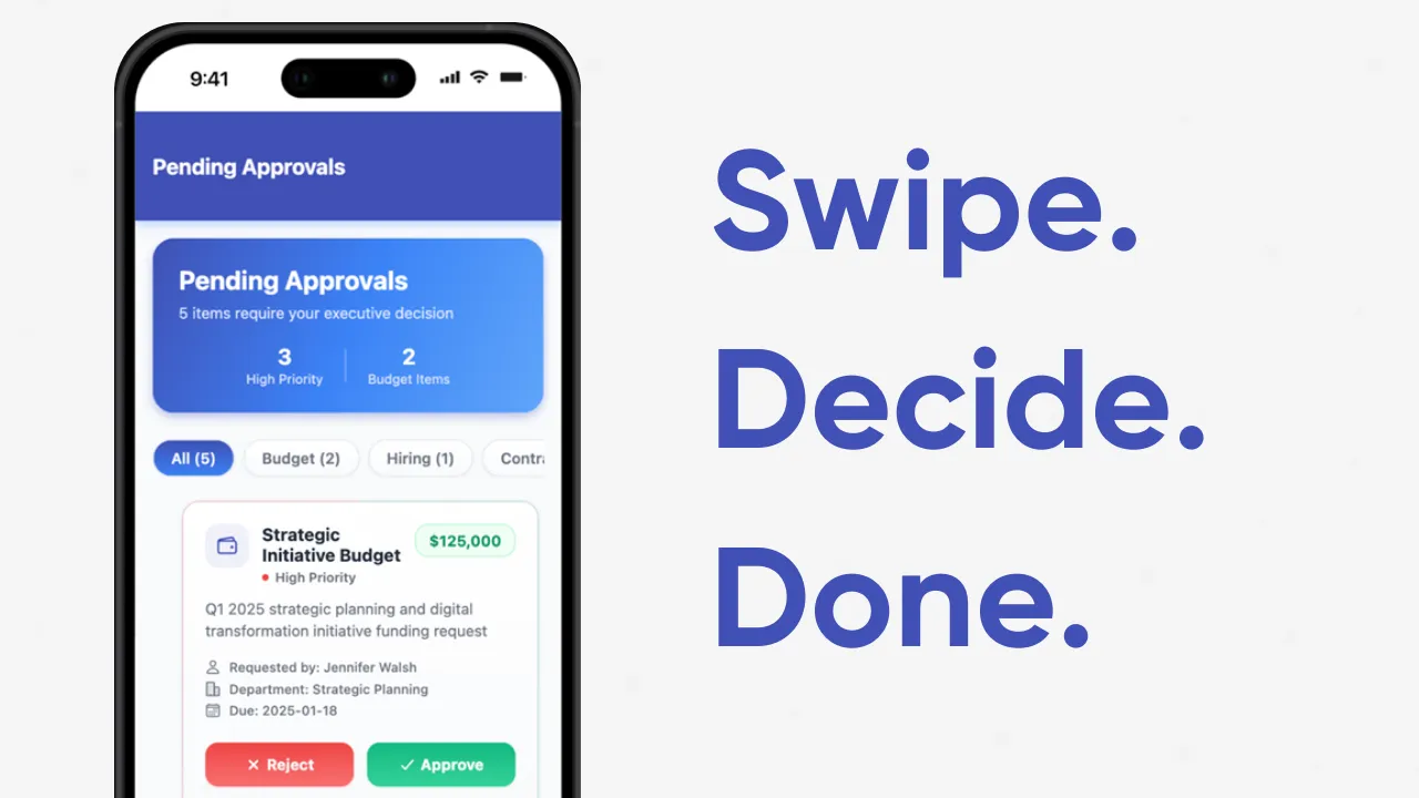 Swipe. Decide. Done. From strategic budget reviews to AI-driven approvals—directly on your phone.